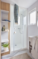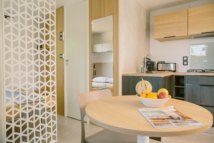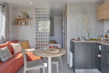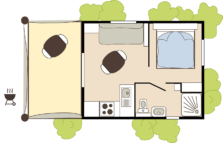 In het centrum van de camping, in een landschappelijk gebied, staat uw stacaravan, van 18 vierkante meter. Deze is voorzien van een ruime slaapkamer met een tweepersoonsbed, en een badkamer met douche 80×120, een hangend toilet en wastafel. De woonkamer krijgt zijn lichtinval door het scherm dat de slaapkamer van de woonkamer scheidt. De voorzieningen in de keuken zijn compleet; wasbak, tafelmodel koelkast, magnetron, 4pits fornuis, afzuigkap, broodrooster …